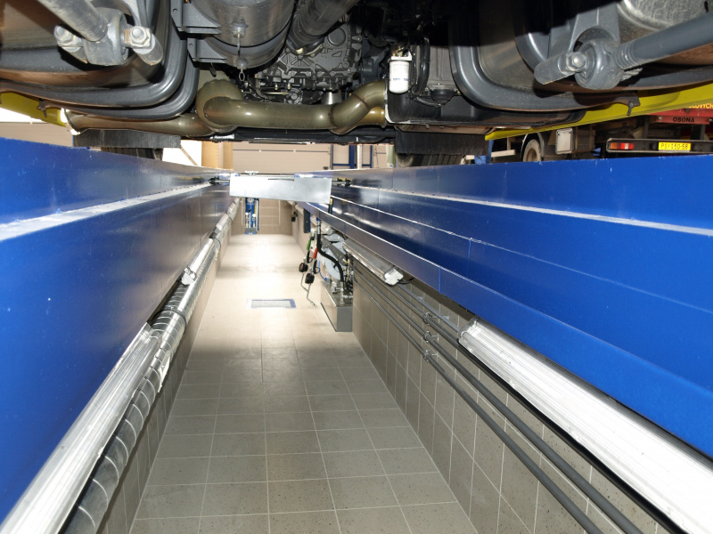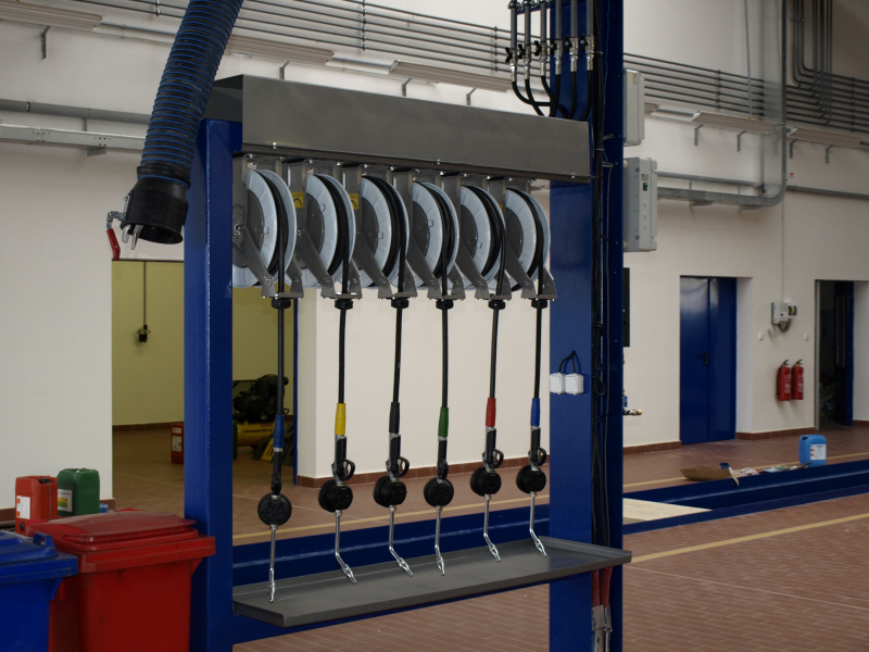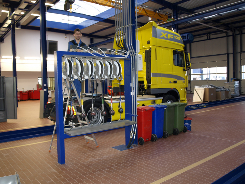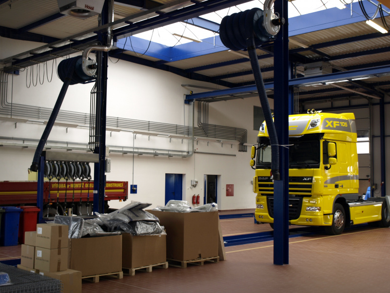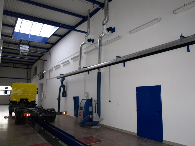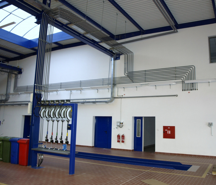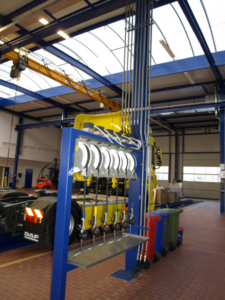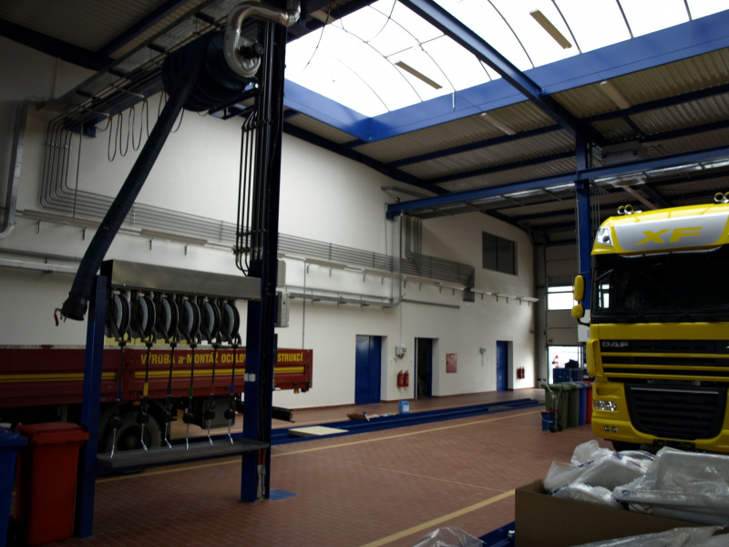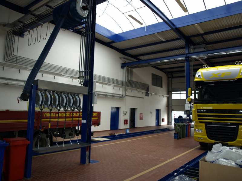 Olejové hospodářství pro servis nákladních automobilů DAF Nýřany. Realizace výdeje nových olejů na výdejním stojanu a v montážní jámě. Odsávání použitého oleje. Součástí dodávky také instalace odsávací lišty výfukových zplodin.