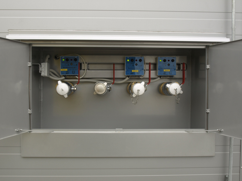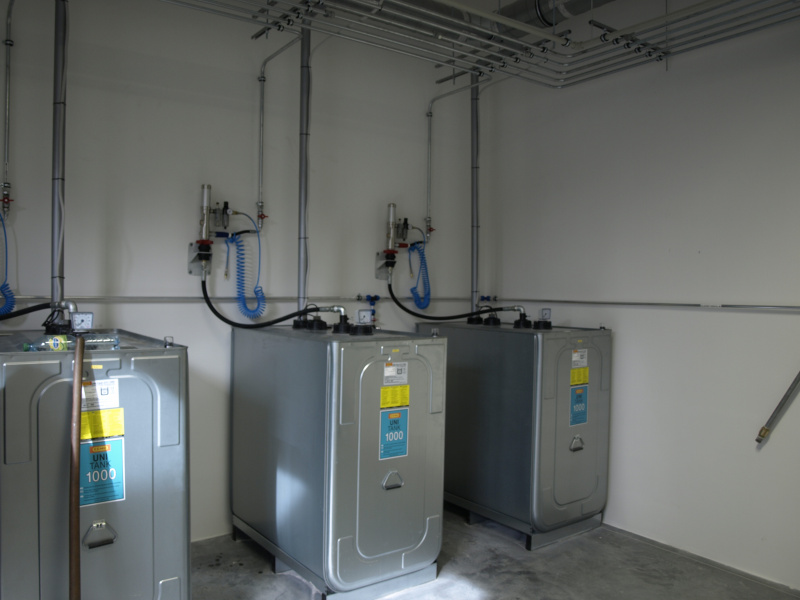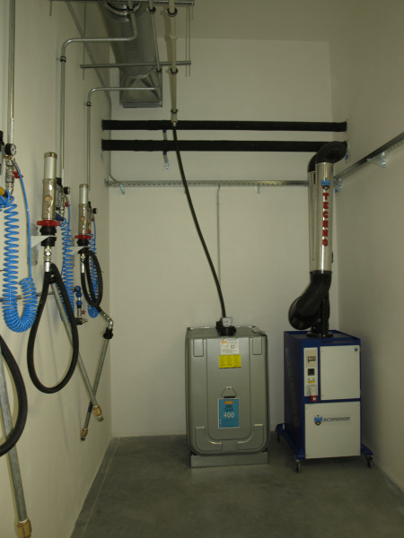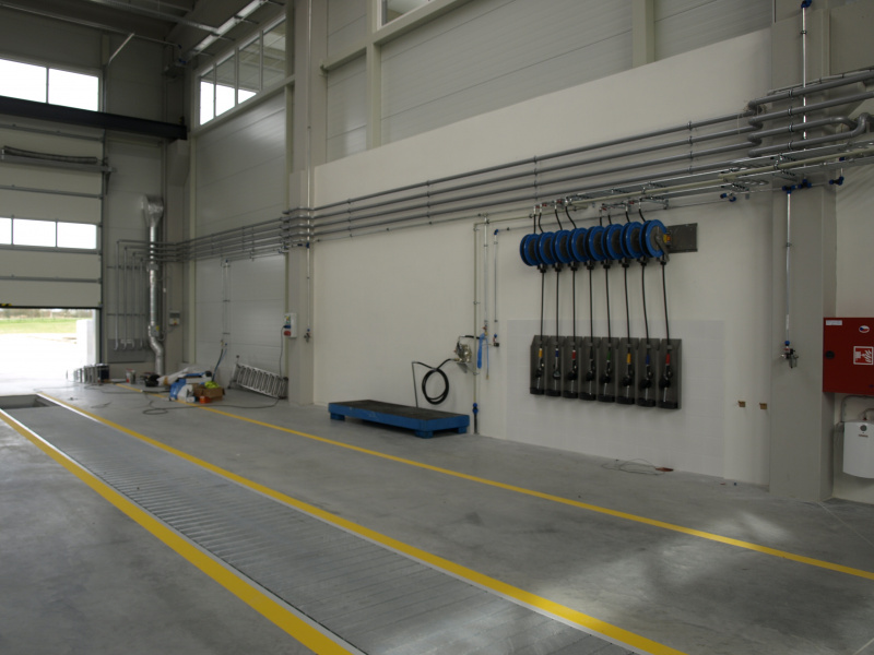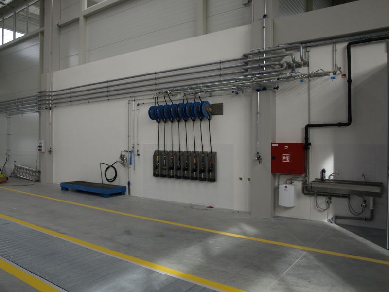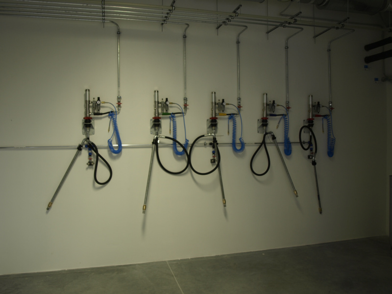 Kompletní dodávka olejového hospodářství pro servis zemědělské techniky Dagros. Výdej nových olejů na navíječích s monitorovacím zařízením. Skladování nových olejů v nádržích napojených a plněných ze stáčecí skříně umístěné na fasádě a vybavené kompletní elektronikou pro snímání hladiny. Součástí dodávky také odsávací ramena pro výfukové zplodiny a mobilní odsávací zařízení pro svařovací plyny.