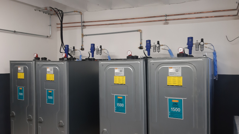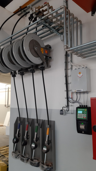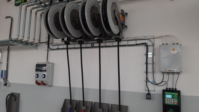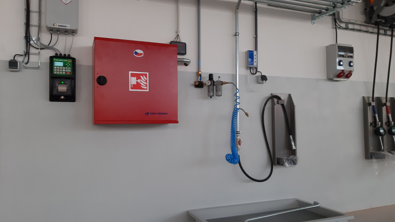 Realizace olejového hospodářství pro servis Scania ProScan Pardubice. Výdej nových olejů pomocí navíječů tlakových hadic. Každé výdejním místo osazené monitoringem výdeje s přenosem do PC. Odsávání použitého oleje pomocí pneumatických odsávacích čerpadel s centrální sběrnou dvouplášťovou celokovovou nádrží. Dodávka vč. kompletní elektroinstalace.